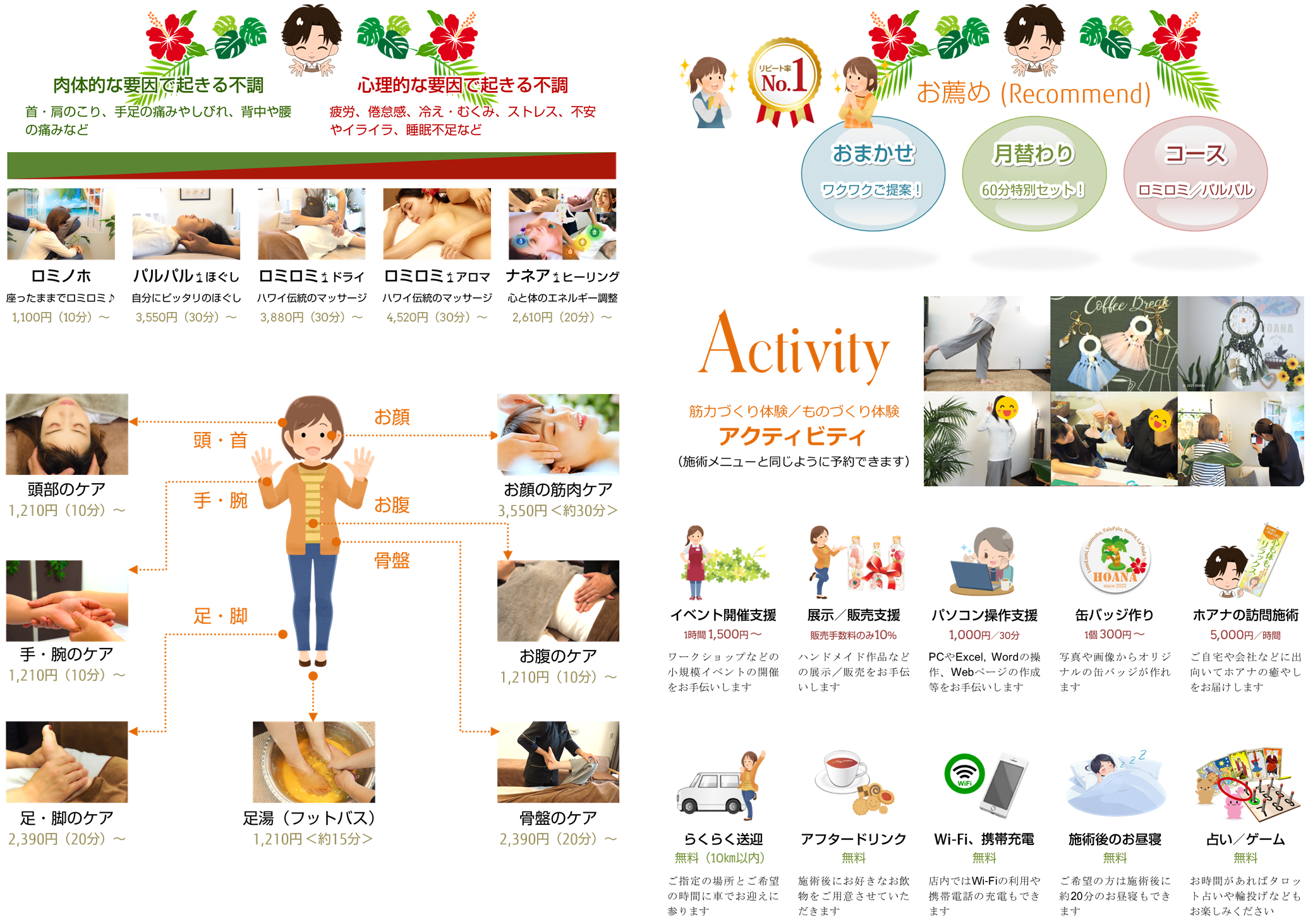 ホアナでは癒しのサービス以外にも『体験型アクティビティ』や『便利なサービス』などもご用意していますので、お気軽にご利用ください。