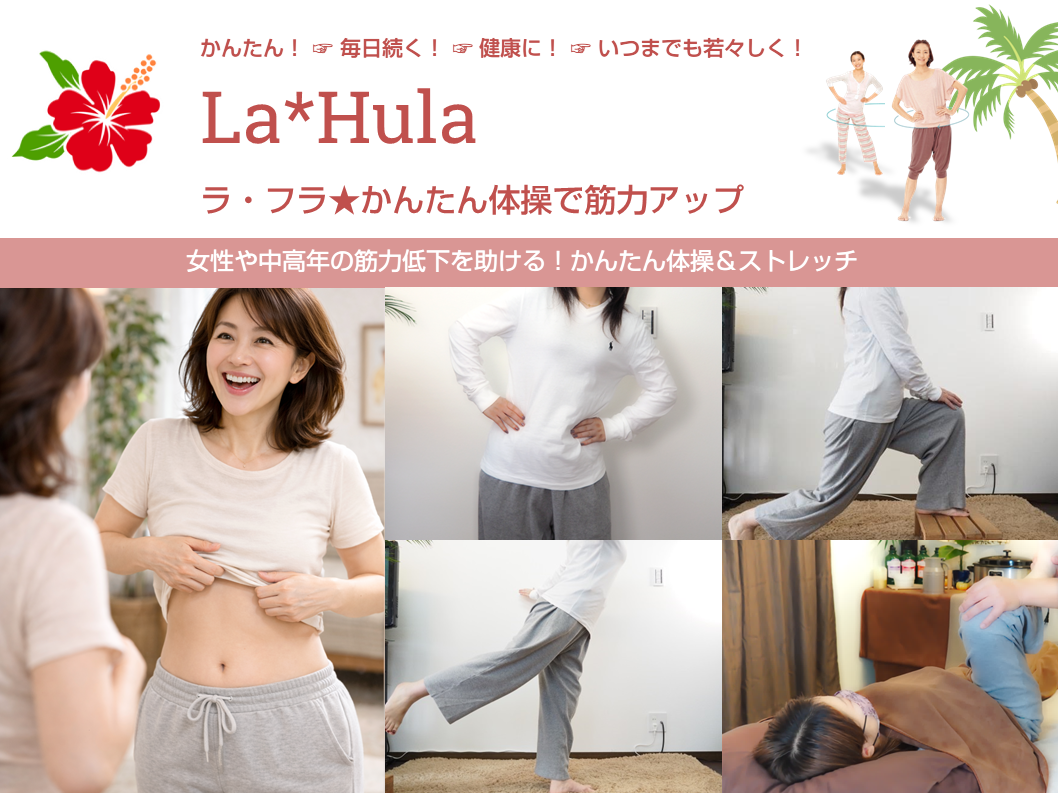 La*Hula(ラ・フラ)は、女性や中高年者層の「筋力アップ」を目的にホアナが開発した簡単エクササイズ・プログラムです。