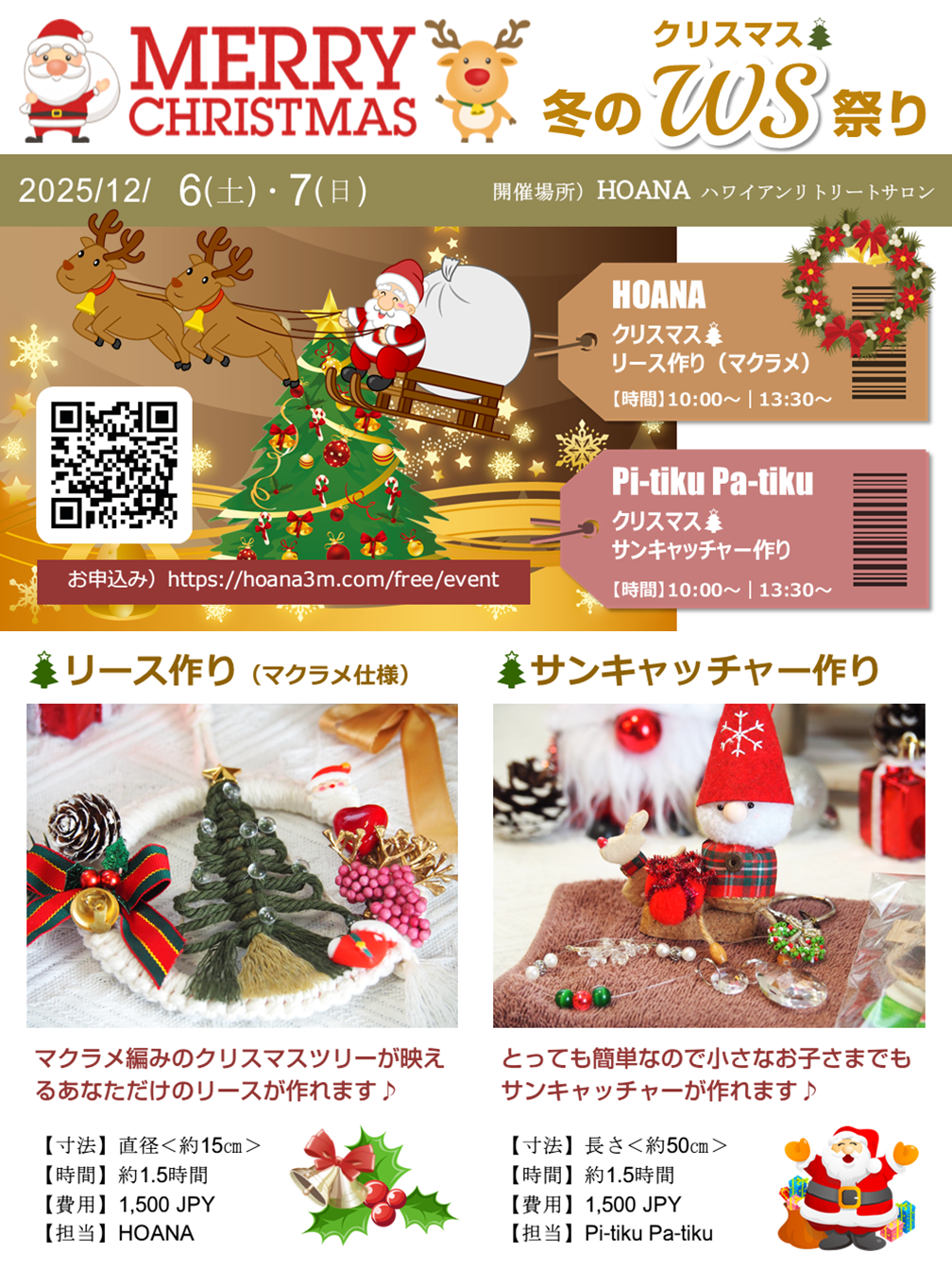 冬のWS祭り 2025 「冬・クリスマス🎄」 ├クリスマス🎄リース作り(マクラメ仕様) └クリスマス🎄サンキャッチャー作り この時期にしかゲットできない可愛い「クリスマス🎄オーナメント」も店内販売しています♪😊 |