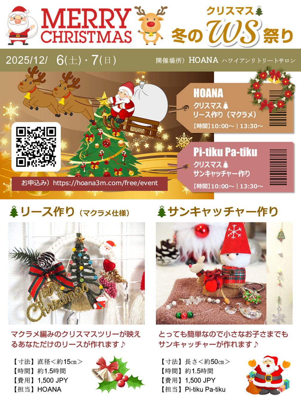 冬のWS祭り 2025 🎄クリスマス リース作り(マクラメ仕様) 🎄クリスマス サンキャッチャー作り この時期だけの可愛い「クリスマスオーナメント」もホアナ店内で販売しています♪😊 |