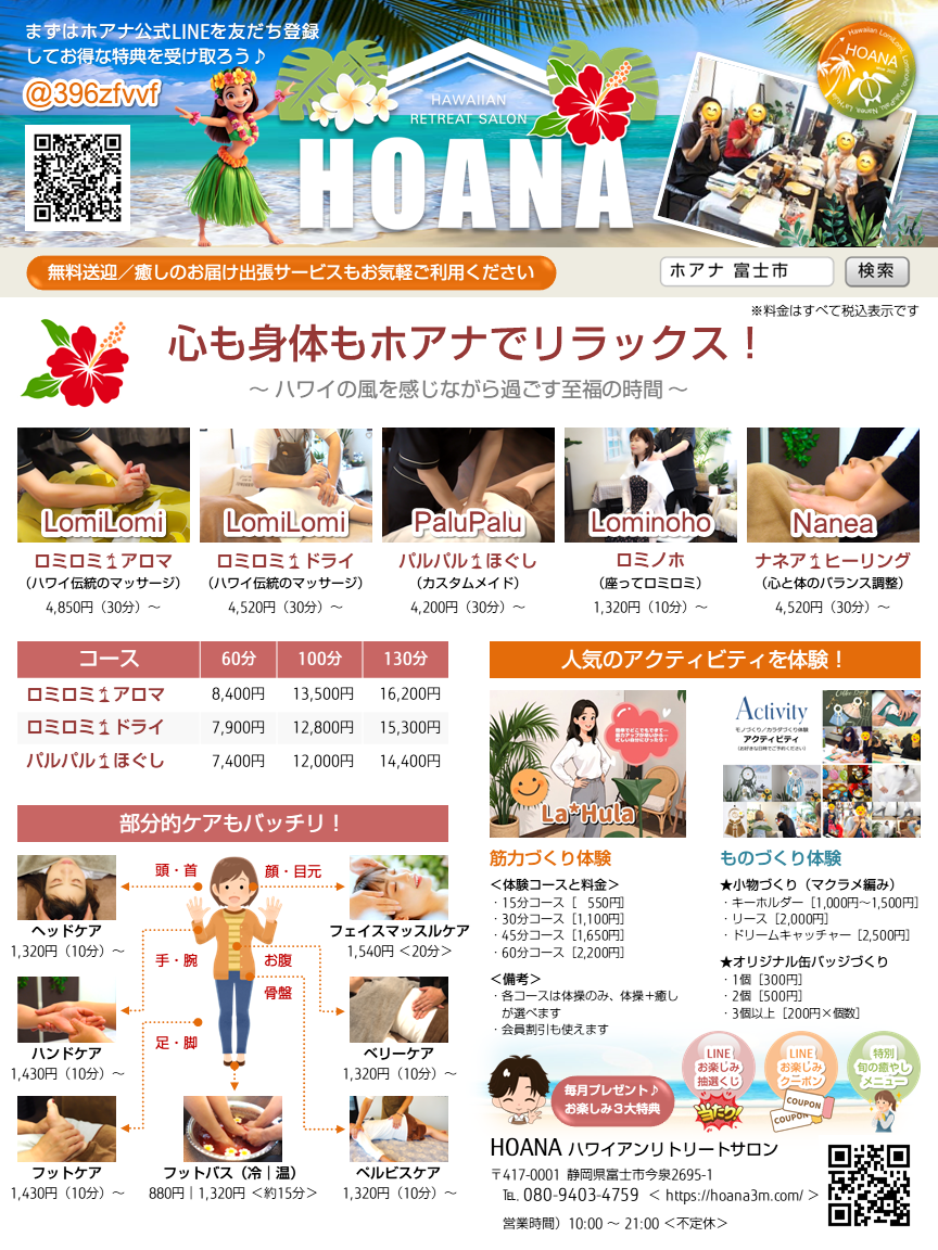├ 半身コース60分 ├ 全身コース100分 └ 贅沢コース130分 ★首・肩のこり、腰痛などをなんとかしたい方にお薦めです♪ |