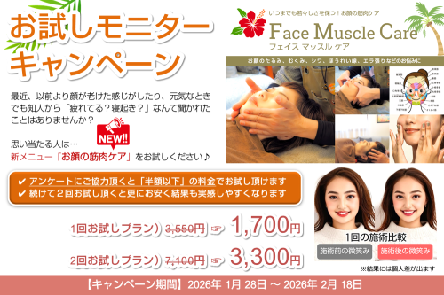お顔の筋肉(表情筋)のケアに興味があってモニター協力して頂ける方は、是非この機会にお試しください!
