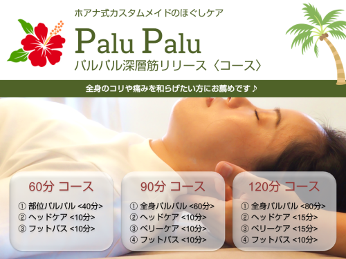 じんわりと深層筋までゆるめる「パルパル🌴ほぐし」が堪能できるコースメニューです!