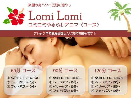 波や風の動きをイメージした全身を使った「とろけるように癒されるロミロミの気持ち良さ」をごゆっくりお楽しみください。